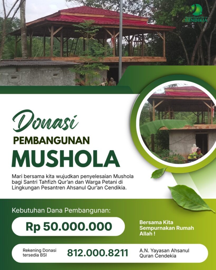 Alhamdulillah pembangunan Mushola sudah mencapai tahap akhir (finishing), namun untuk tahap ini dibutuhkan biaya Rp. 50.000.000 (lima puluh juta rupiah) untuk menyelesaikannya. Mushola tersebut digunakan untuk santri penghafal Al-qur’an, para petani dan warga sekitar.